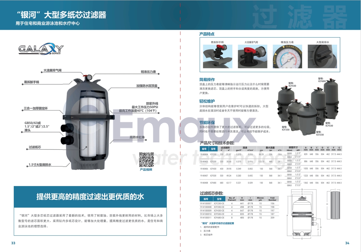 “銀河”大型多芯紙芯過濾器采用了最新的技術(shù),使用了耐腐蝕、防紫外線更耐用的材料,比市場上大多數(shù)型號的濾芯面積更大。采用缸內(nèi)多紙芯設(shè)計,能夠加大處理量,提高精度過濾更優(yōu)質(zhì)的水,是住宅和商業(yè)游泳池的理想選擇。