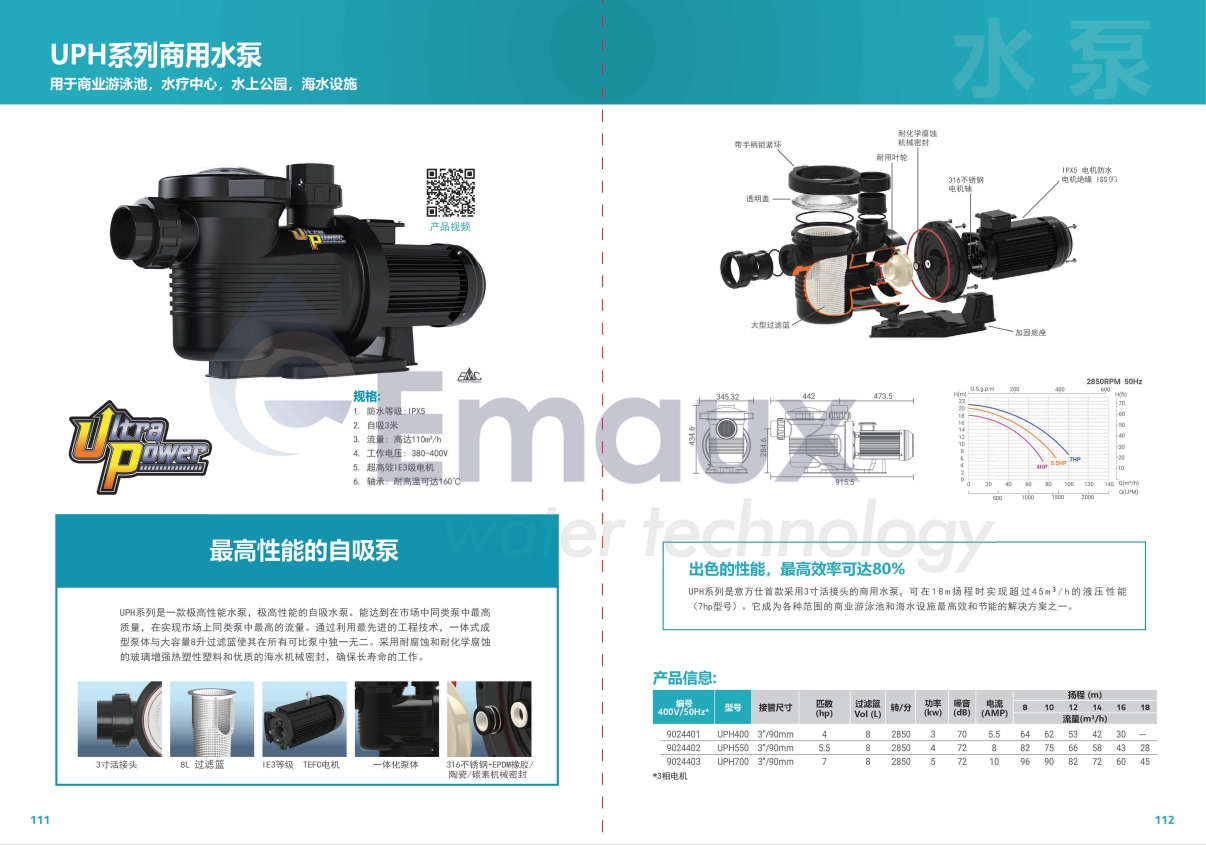 UPH系列是一款極高性能水泵,極高性能的自吸水泵。能達到在市場中同類泵中最高質(zhì)量,在實現(xiàn)市場上同類泵中最高的流量。通過利用最先進的工程技術(shù),一體式成型泵體與大容量8升過濾籃使其在所有可比泵中獨一無二。采用耐腐蝕和耐化學(xué)腐蝕的玻璃增強熱塑性塑料和優(yōu)質(zhì)的海水機械密封,確保長壽命的工作。