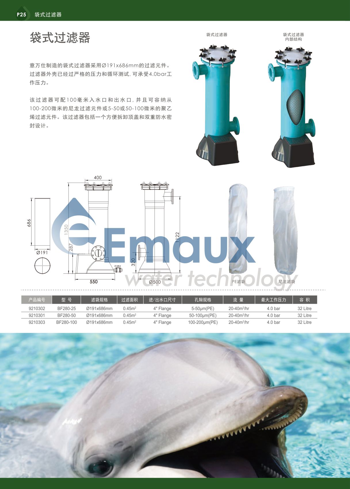 競技池意萬仕制造的袋式過濾器采用0191x686mm的過濾元件。過濾器外殼已經(jīng)過嚴(yán)格的壓力和循環(huán)測試,可承受4.0bar工作壓力。 該過濾器可配100毫米入水口和出水口, 并且可容納從100-200微米的尼龍過濾元件或5-50或50-100微米的聚乙烯過濾元件。該過濾器包括一個方便拆卸頂蓋和雙重防水密封設(shè)計。