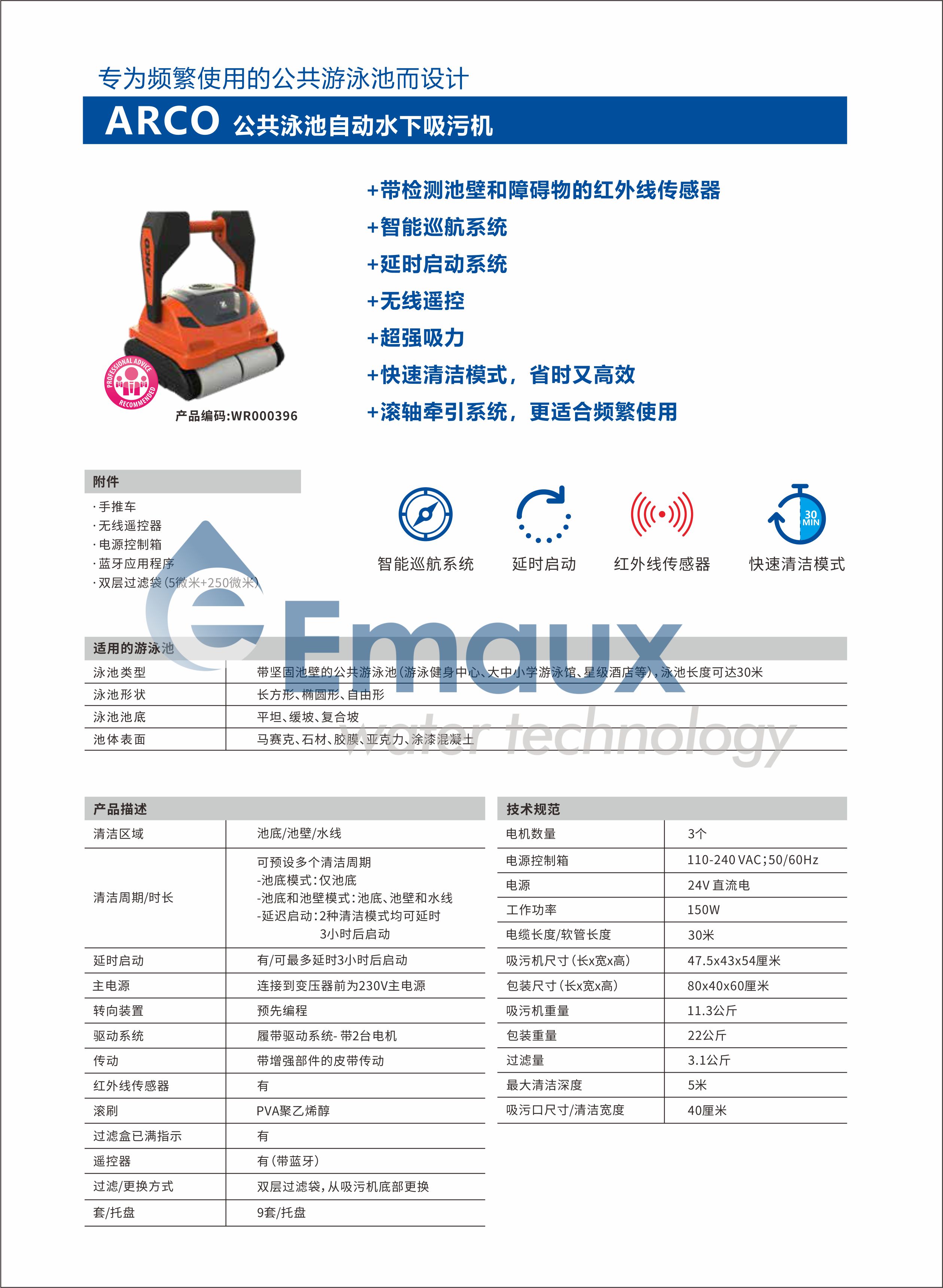 ★氣旋抽吸技術(shù)+超強(qiáng)吸污能力 ★雙層過濾袋 ★滾軸牽引系統(tǒng),更適合頻繁使用 ★帶檢測(cè)池壁和障礙物的紅外線傳感器 ★無線遙控,能手動(dòng)能定點(diǎn)操作清潔 ★智能巡航系統(tǒng) ★配有手推車,使用更方便 ★專為頻繁使用的公共游泳池而設(shè)計(jì)