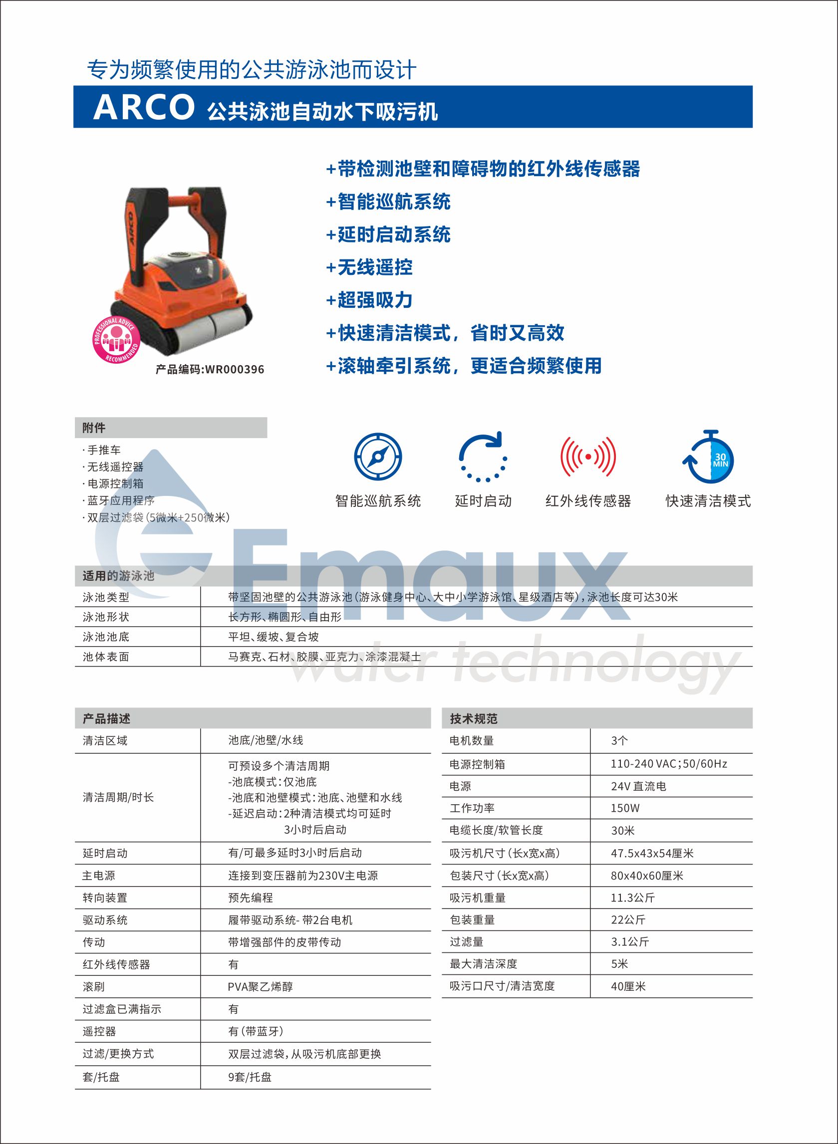 ★氣旋抽吸技術(shù)+超強吸污能力 ★雙層過濾袋 ★滾軸牽引系統(tǒng),更適合頻繁使用 ★帶檢測池壁和障礙物的紅外線傳感器 ★無線遙控,能手動能定點操作清潔 ★智能巡航系統(tǒng) ★配有手推車,使用更方便 ★專為頻繁使用的公共游泳池而設(shè)計