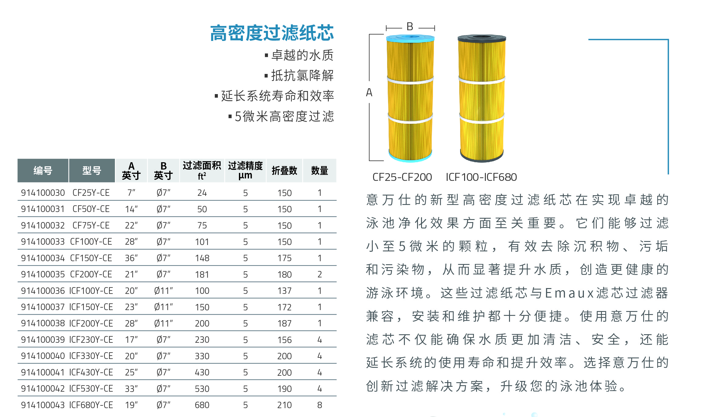 競技池它們能夠過濾 小至5微米的顆粒,有效去除沉積物、污垢 和污染物,從而顯著提升水質(zhì),創(chuàng)造更健康的 游泳環(huán)境。這些過濾紙芯與Emaux濾芯過濾器 兼容,安裝和維護(hù)都十分便捷。使用意萬仕的 濾芯不僅能確保水質(zhì)更加清潔、安全,還能 延長系統(tǒng)的使用壽命和提升效率。選擇意萬仕的 創(chuàng)新過濾解決方案,升級您的泳池體驗(yàn)。