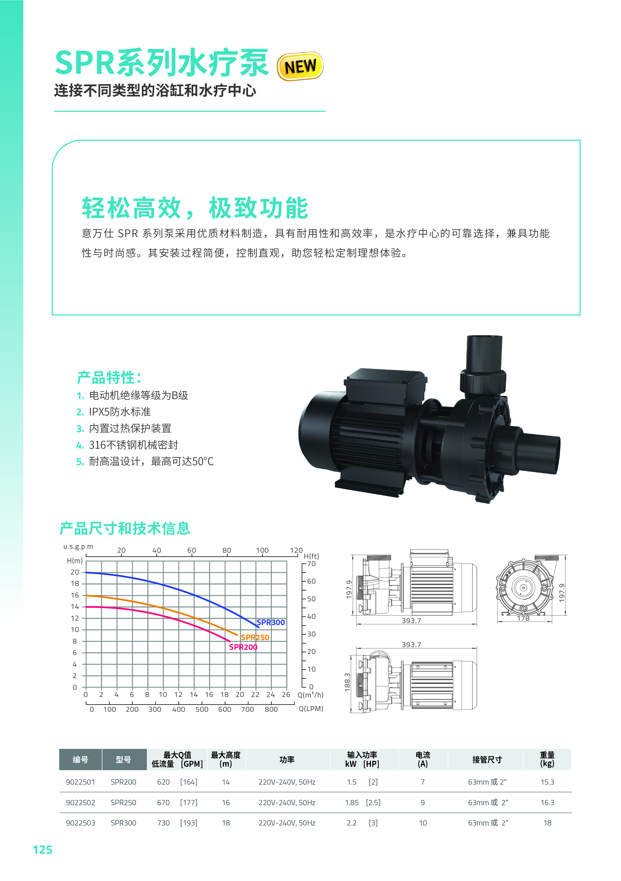 意萬仕 SPR 系列泵采用優(yōu)質材料制造,具有耐用性和高效率,是水療中心的可靠選擇,兼具功能 性與時尚感。其安裝過程簡便,控制直觀,助您輕松定制理想體驗。