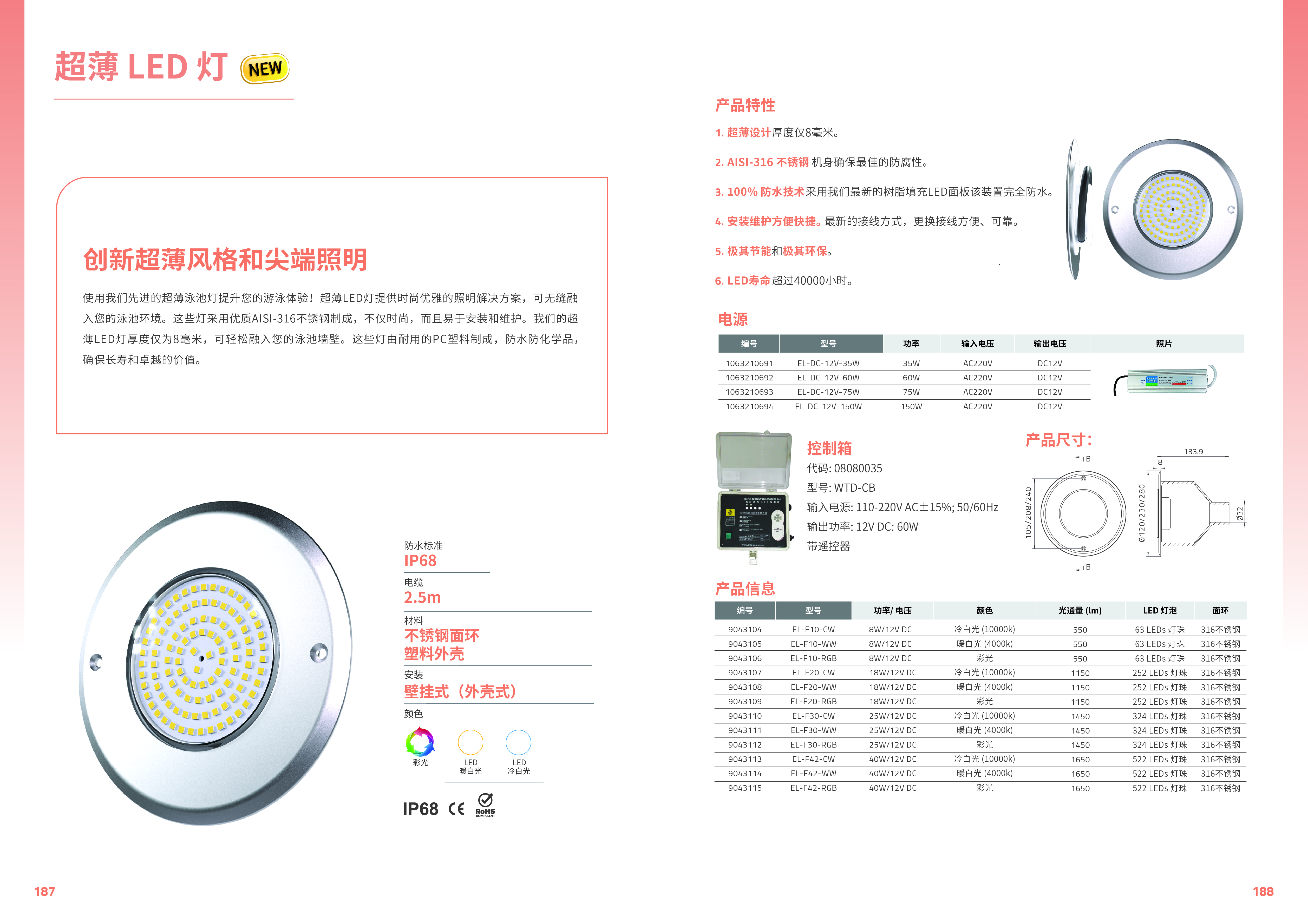 競(jìng)技池使用我們先進(jìn)的超薄泳池?zé)籼嵘挠斡倔w驗(yàn)!超薄LED燈提供時(shí)尚優(yōu)雅的照明解決方案,可?縫融 入您的泳池環(huán)境。這些燈采用優(yōu)質(zhì)AISI?316不銹鋼制成,不僅時(shí)尚,?且易于安裝和維護(hù)。我們的超 薄LED燈厚度僅為8毫?,可輕松融入您的泳池墻壁。這些燈由耐用的PC塑料制成,防水防化學(xué)品, 確保長(zhǎng)壽和卓越的價(jià)值。
