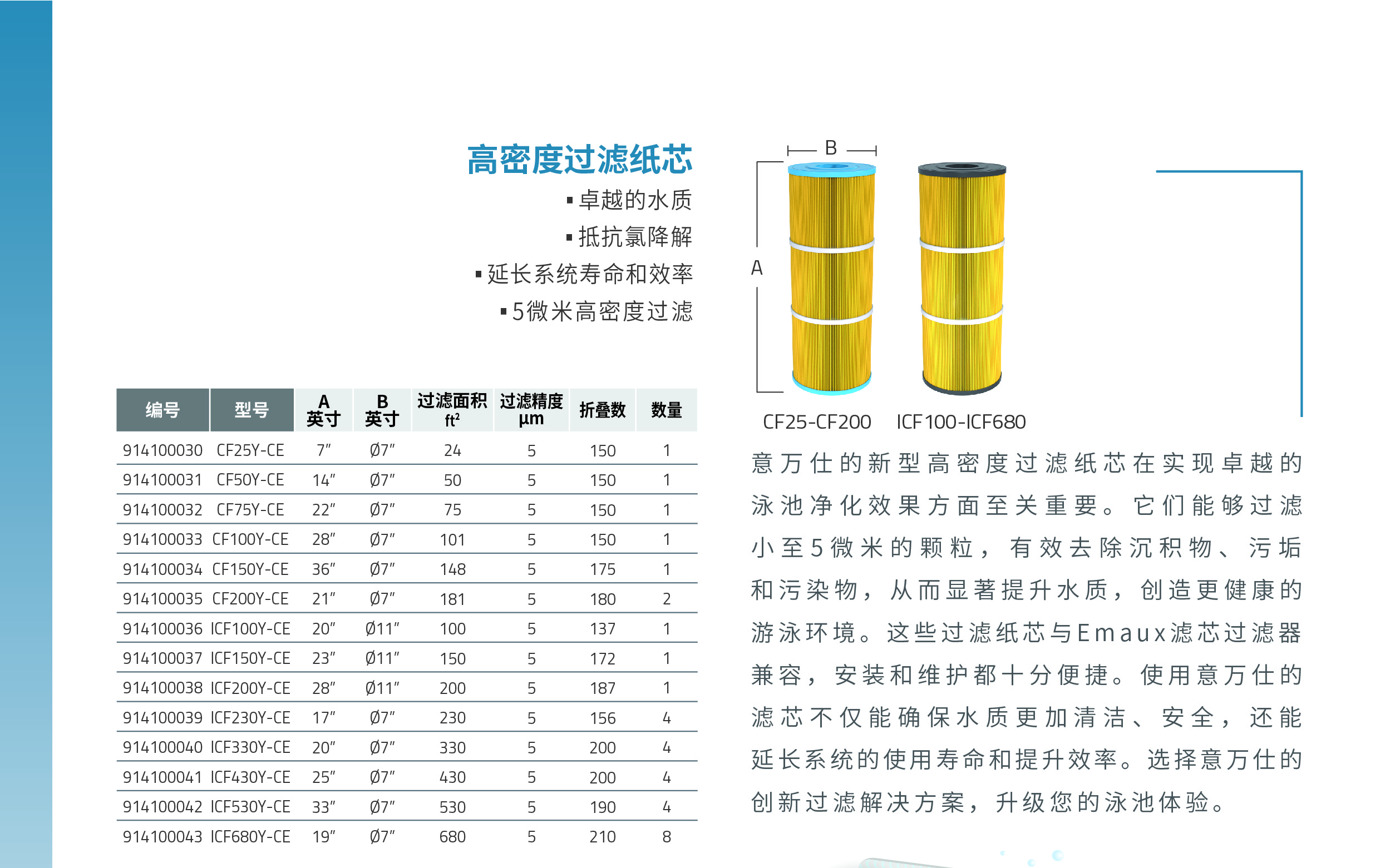 意萬(wàn)仕的新型高密度過(guò)濾紙芯在實(shí)現(xiàn)卓越的 泳池凈化效果方面至關(guān)重要。它們能夠過(guò)濾 小至5微米的顆粒,有效去除沉積物、污垢 和污染物,從而顯著提升水質(zhì),創(chuàng)造更健康的 游泳環(huán)境。這些過(guò)濾紙芯與Emaux濾芯過(guò)濾器 兼容,安裝和維護(hù)都十分便捷。使用意萬(wàn)仕的 濾芯不僅能確保水質(zhì)更加清潔、安全,還能 延長(zhǎng)系統(tǒng)的使用壽命和提升效率。選擇意萬(wàn)仕的 創(chuàng)新過(guò)濾解決方案,升級(jí)您的泳池體驗(yàn)。