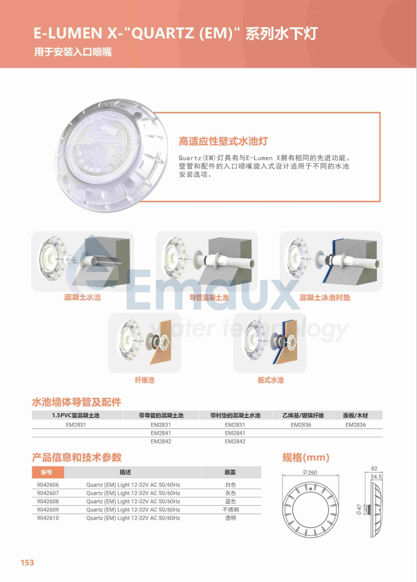 競技池Quartz(EM)燈具有與E-Lumen X相同的先進功能。壁管和配件的入口噴嘴旋入式設(shè)計適用于不同的水池安裝選項。