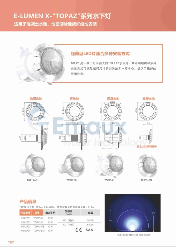 競技池TOPAZ 是一款小巧而強大的13W LED水下燈。其纖細(xì)結(jié)構(gòu)和多種安裝方式可滿足任何尺寸的游泳池和水療中心,提供了極好的照明效果。