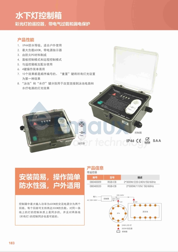 競技池控制箱中最大輸入功率為600W的交流電源分為兩個回路,每個回路可支持高達300W的負載。對同一條線上的燈的控制本質(zhì)上是同步的,并且對兩條線(所有燈)的控制同步也是可能的。