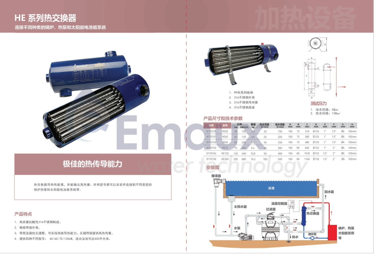 4. 提供四種不同型號(hào): 40, 60, 75, 120kW,適合泳池可達(dá)450平方米