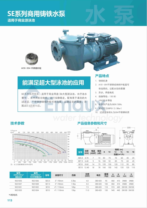 競技池SE系列商用鐵泵,適用于商業(yè)用途(如大型游泳池、水療池水景等)。采用高能效電機,運行安靜穩(wěn)定,配有易于清洗的大濾籃。不銹鋼和鑄鐵葉輪可供選擇,以滿足您的需要,范圍從5.5匹到15匹。