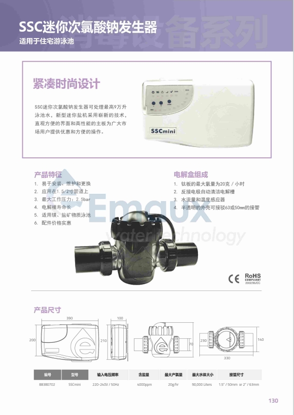競(jìng)技池SSC迷你次氯酸鈉發(fā)生器可處理最高9萬(wàn)升泳池水,新型迷你鹽機(jī)采用嶄新的技術(shù),直觀方便的界面和高性能的主板為廣大市場(chǎng)用戶提供優(yōu)惠和方便的操作。