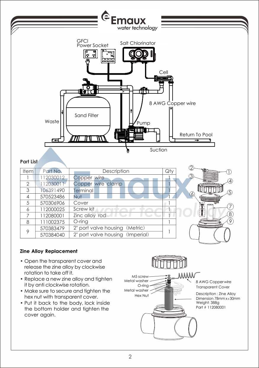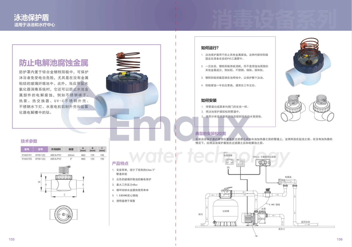 競技池防護罩內(nèi)置于鋅犧牲陽極中,可保護沐浴者免受電擊危險,尤其是在沒有金屬粘結(jié)的玻璃纖維池中。此外,當(dāng)應(yīng)用鹽水氯化器消毒系統(tǒng)時,它還可以防止水池金屬部件的電解腐蝕,例如不銹鋼梯子,熱泵熱交換器, UV-C不銹鋼外殼,不銹鋼水下燈,水泵電機鋁制外殼和鹽氯化器電解槽中的鈦。