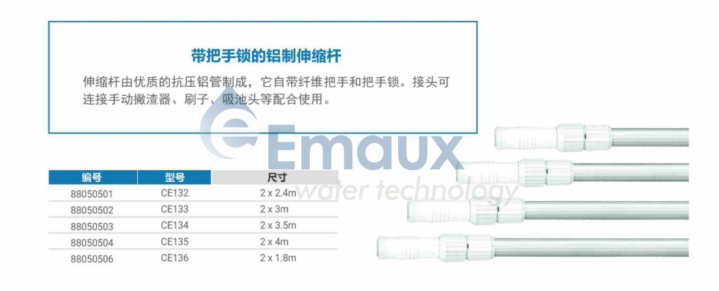 伸縮桿由優(yōu)質的抗壓鋁管制成,它自帶纖維把手和把手鎖。接頭可連接手動撇渣器、刷子、吸池頭等配合使用。